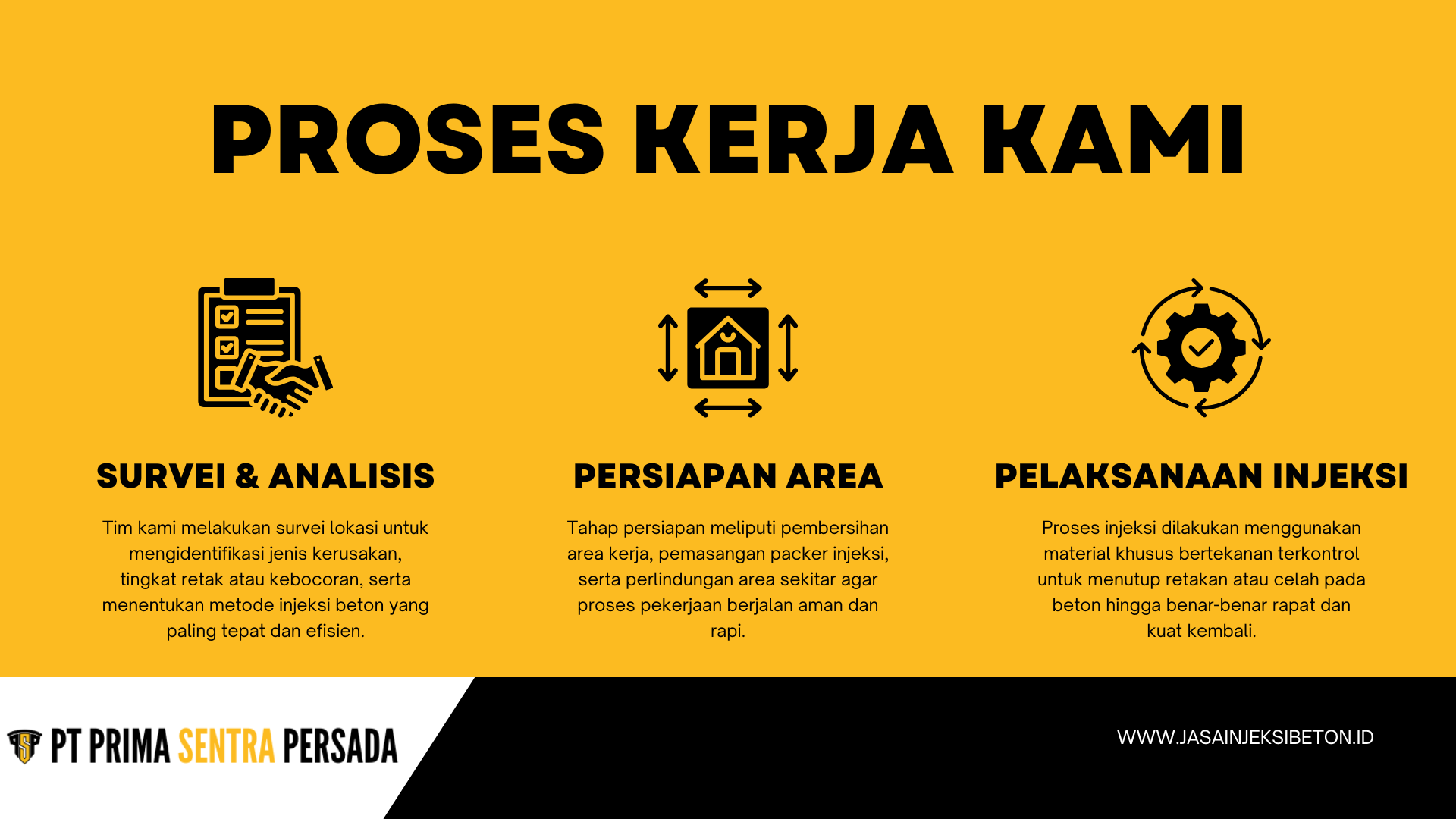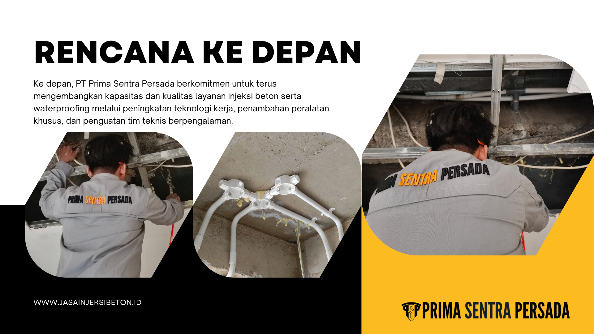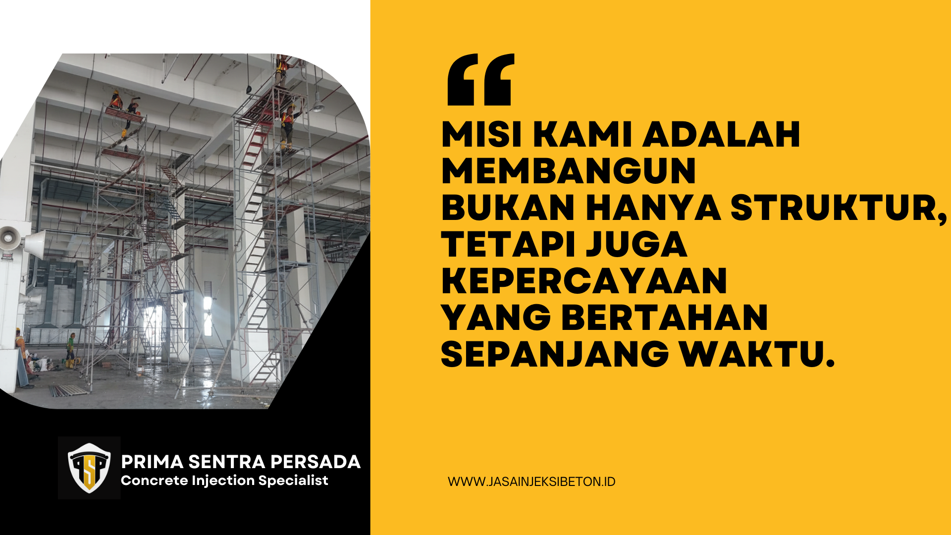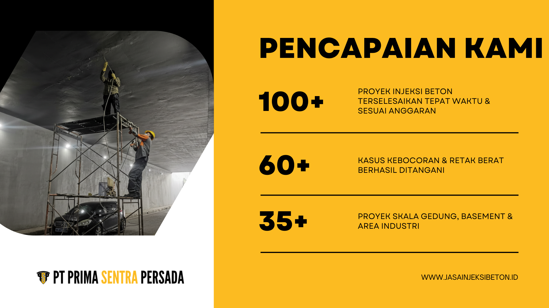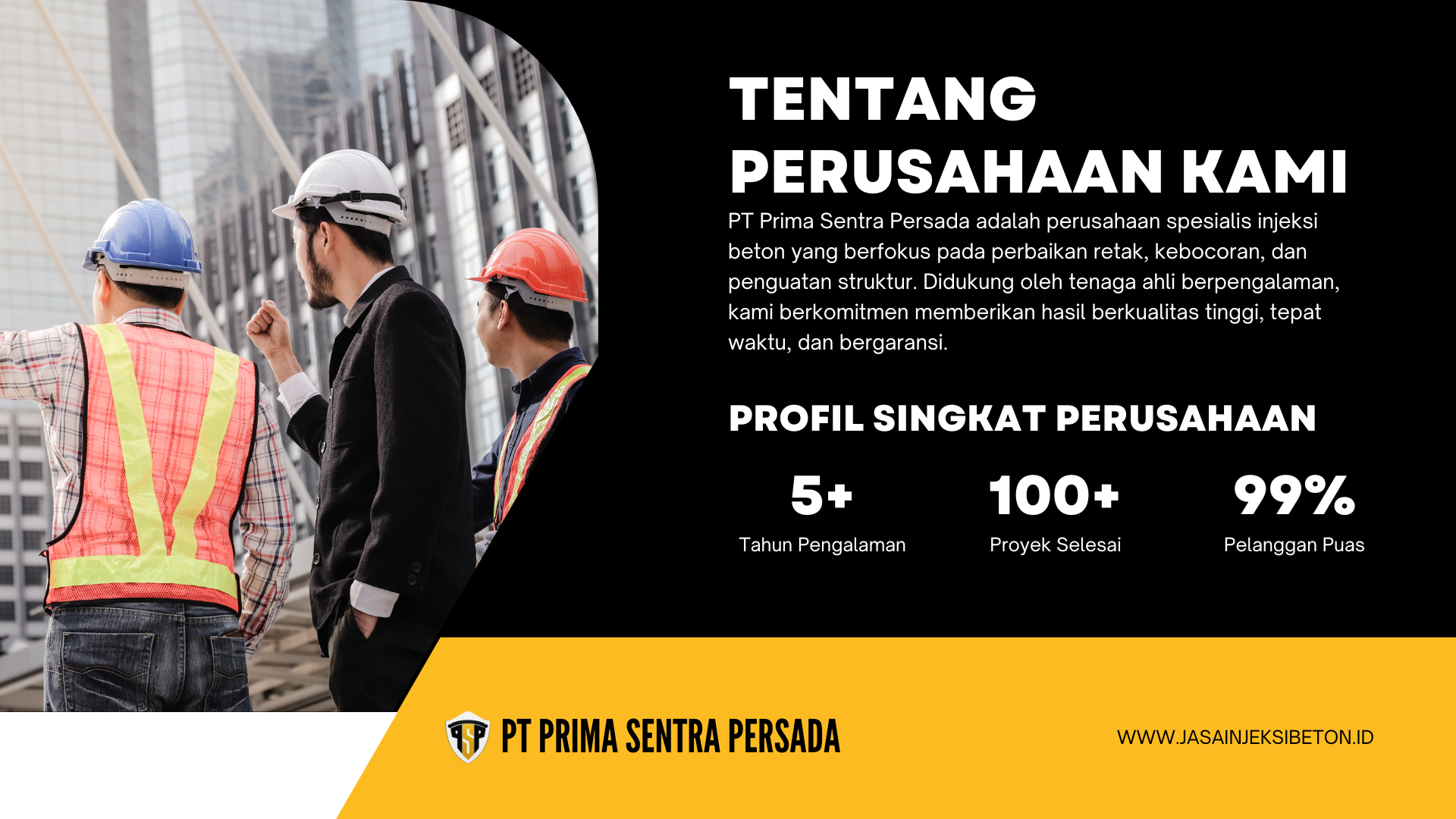 PT Prima Sentra Persada adalah perusahaan spesialis injeksi beton yang menangani perbaikan retak struktur, kebocoran, serta penguatan struktur bangunan. Didukung oleh tim teknis berpengalaman dan metode kerja yang teruji, kami berkomitmen memberikan hasil yang presisi, tepat waktu, dan bergaransi untuk setiap proyek yang kami kerjakan.
